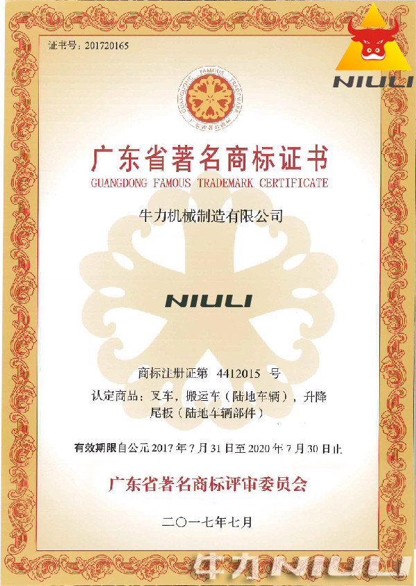 2017年7月,牛力榮獲廣東省著名商標,廣東省著名商標是指在廣東省內具有較高市場信譽、為相關公眾所熟知的注冊商標。這次獲頒 廣東省著名商標證書,標志著牛力的品牌知名度已經達到相當?shù)母叨群退疁?,叉車、搬運車、升降尾板已經擁有物流設備制造業(yè)的著名品牌口碑。