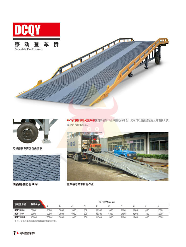 DCQY系列移動(dòng)式登車橋適用于裝卸作業(yè)不固定的場(chǎng)合,叉車可以直接通過它從地面駛?cè)胴涇嚿线M(jìn)行裝卸作業(yè),該產(chǎn)品具有高強(qiáng)度的焊接鋼構(gòu),表面鋪設(shè)防滑鐵網(wǎng),使裝卸作業(yè)更安全、更快捷、更高效。