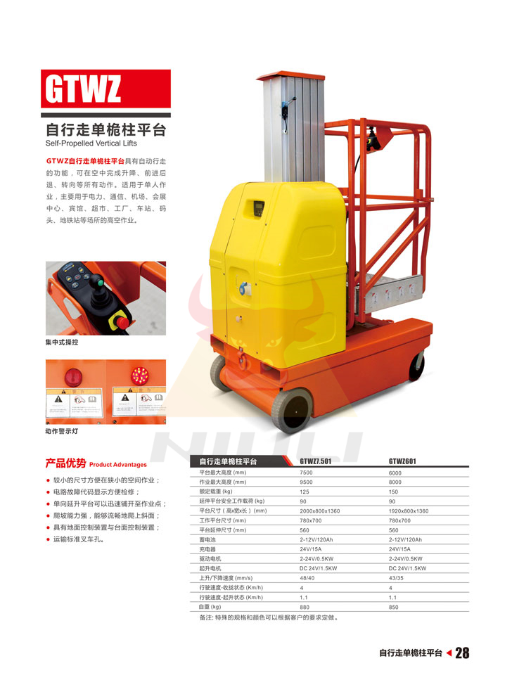 具有自動行走的功能,可在空中完成升降、前進后退、轉向等所有動作。適用于單人作業(yè),主要用于電力、通信、機場、會展中心、賓館、超市、工廠、車站、碼頭、地鐵站等場所的高空作業(yè)。